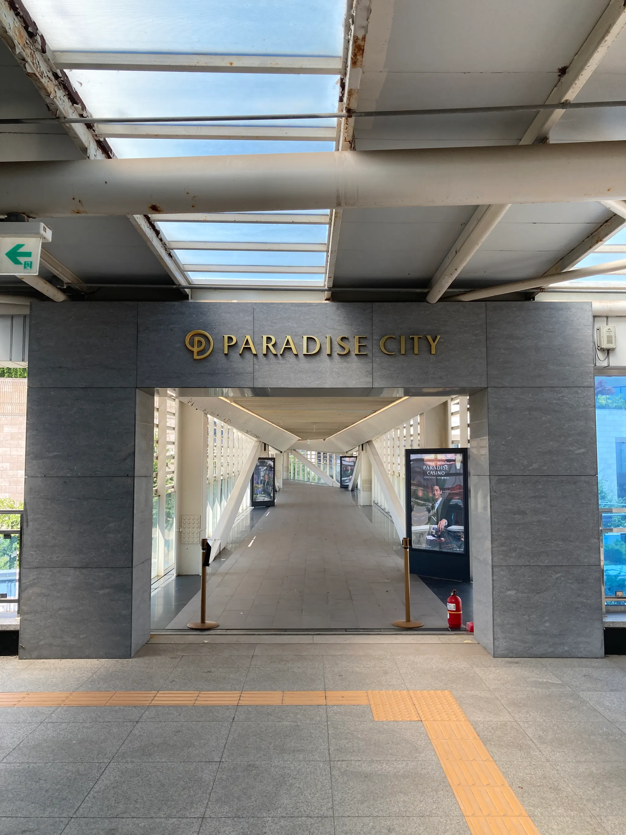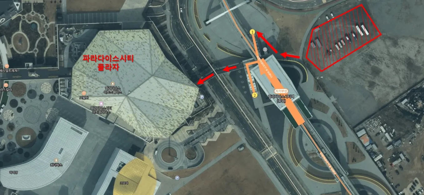 주차 후 도보 이동 → 파라다이스시티역 1번 출구 계단 진입 → 구름다리로 플라자 이동